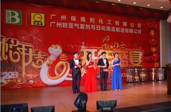 廣州保賜利化工有限公司、廣州歐亞氣霧劑與日化用品制造有限公司籌備多日的新春開年晚宴于2013年2月28日晚6點(diǎn)在從化南海食街拉開序幕,近兩千多人的晚宴現(xiàn)場顯得熱鬧非凡,充滿著激情、熱烈、活躍的氣氛。