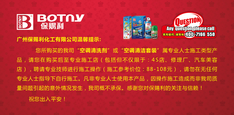 因我司研制并首推的“空調(diào)清洗劑”及“2013年上榜中央電視臺(tái)的“空調(diào)清潔套裝”均屬專(zhuān)業(yè)施工類(lèi)產(chǎn)品,施工過(guò)程雖無(wú)需專(zhuān)業(yè)設(shè)備,但在施工過(guò)程中涉及專(zhuān)業(yè)知識(shí)及專(zhuān)業(yè)技能,因此,我司建議各位買(mǎi)家在購(gòu)買(mǎi)上述產(chǎn)品后,在無(wú)任何專(zhuān)業(yè)人士指導(dǎo)下請(qǐng)勿自行施工,以免造成因操作不當(dāng)而引起意外情況發(fā)生。凡非專(zhuān)業(yè)人士操作施工而引起的意外情況發(fā)生,因操作施工造成而非我司質(zhì)量問(wèn)題,我司概不承保。