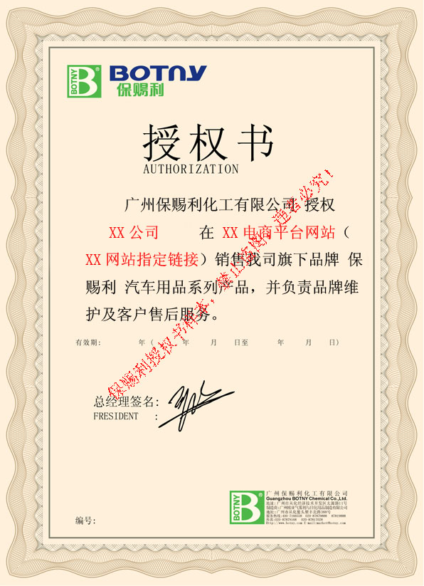 1、請(qǐng)各位網(wǎng)絡(luò)買家在購買廣州保賜利化工有限公司旗下系列品牌之系列產(chǎn)品時(shí),選擇正規(guī)、正品網(wǎng)店進(jìn)行購買,我司已對(duì)銷售我司產(chǎn)品網(wǎng)絡(luò)銷售商予以審查,并對(duì)合格網(wǎng)銷商簽發(fā)專屬網(wǎng)絡(luò)銷售運(yùn)營授權(quán)書,為維護(hù)廣大網(wǎng)絡(luò)買家權(quán)益,我司在本平臺(tái)予以公布授權(quán)書標(biāo)準(zhǔn)版本,以供大家購買保賜利產(chǎn)品時(shí)鑒別正品賣家。(授權(quán)書標(biāo)準(zhǔn)版本請(qǐng)見本頁下示圖片)