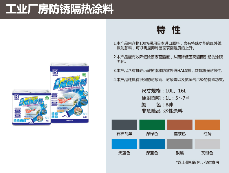 特性:本產品內容物采用100%的進口原裝材料,里面含有特殊的紅外線反射顏料和空中微粒,可以明顯抑制屋面表面溫度上升。這種涂料還有降低涂膜表面溫度,從而降低因為高溫而引起的涂膜老化,除此之外這種節(jié)能隔熱降溫涂料還具有防水的功能和防銹的功能,價格方面跟同種涂料也占有極大的優(yōu)勢,反射隔熱涂料價格可向公司相關銷售人員咨詢。