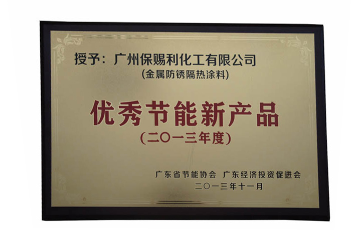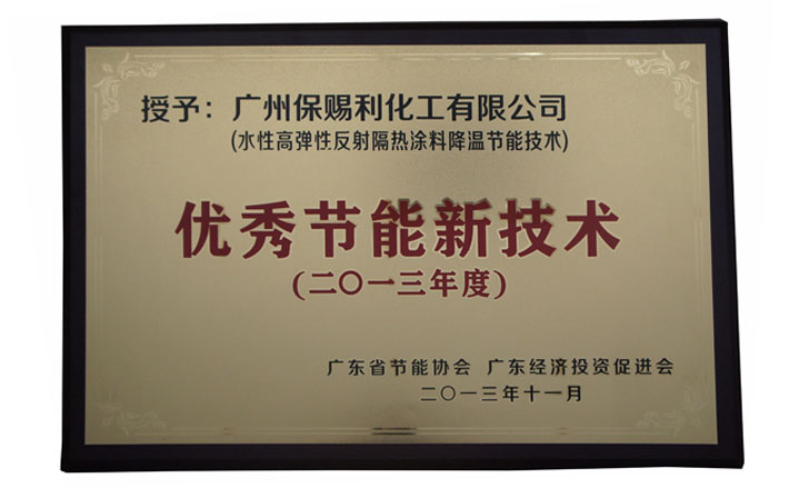 由廣東省投資促進(jìn)會(huì)、廣東省節(jié)能協(xié)會(huì)組織《關(guān)于開(kāi)展2013年度節(jié)能與投資、優(yōu)秀節(jié)能新技術(shù)和優(yōu)秀節(jié)能新產(chǎn)品的通知》的活動(dòng)中,經(jīng)單位自愿,本著公正、公平、公開(kāi)的原則,在公示期間,聽(tīng)取各界意見(jiàn)后,經(jīng)專(zhuān)家審核,最終,廣州保賜利化工有限公司憑借優(yōu)秀的隔熱節(jié)能產(chǎn)品和技術(shù),榮獲了“2013年度優(yōu)秀節(jié)能新產(chǎn)品——廣州保賜利化工有限公司(BOTNY金屬防銹隔熱涂料)”和 “2013年度優(yōu)秀節(jié)能新技術(shù)——廣州保賜利化工有限公司(BOTNY水性高彈性反射隔熱涂料降溫節(jié)能技術(shù))”,并頒發(fā)了榮譽(yù)牌匾,著標(biāo)志著廣州保賜利化工有限公司的建筑隔熱節(jié)能產(chǎn)品和技術(shù)獲得了廣泛的支持和認(rèn)可,是值得廣大消費(fèi)者、建設(shè)單位、設(shè)計(jì)單位和節(jié)能單位應(yīng)用,并能獲得很好的社會(huì)效益與經(jīng)濟(jì)效益的回報(bào)和增值。