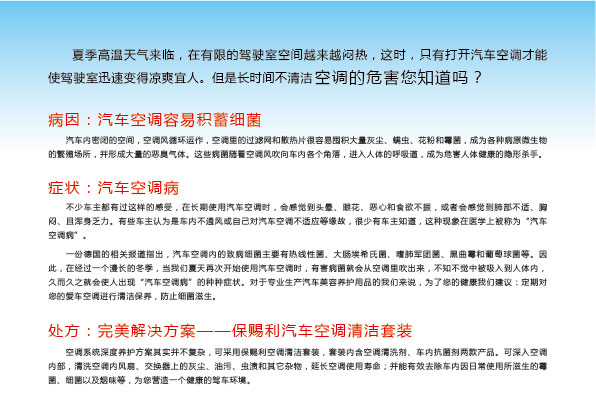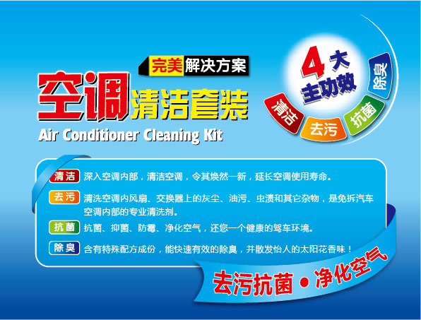空調清洗劑:本品采用新一代技術及環(huán)保型原料精制而成,可深入空調內部,清洗空調內風扇、交換器上的灰塵、油垢、蟲漬和其它雜物,并散發(fā)怡人的太陽花香味!能有效的保養(yǎng)空調、除臭,延長空調使用壽命,是免拆汽車空調內部的專業(yè)清洗劑。