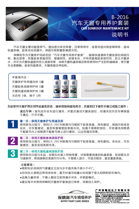 ●建議每半年使用保賜利天窗養(yǎng)護(hù)套裝進(jìn)行保養(yǎng),效果持久保護(hù)。